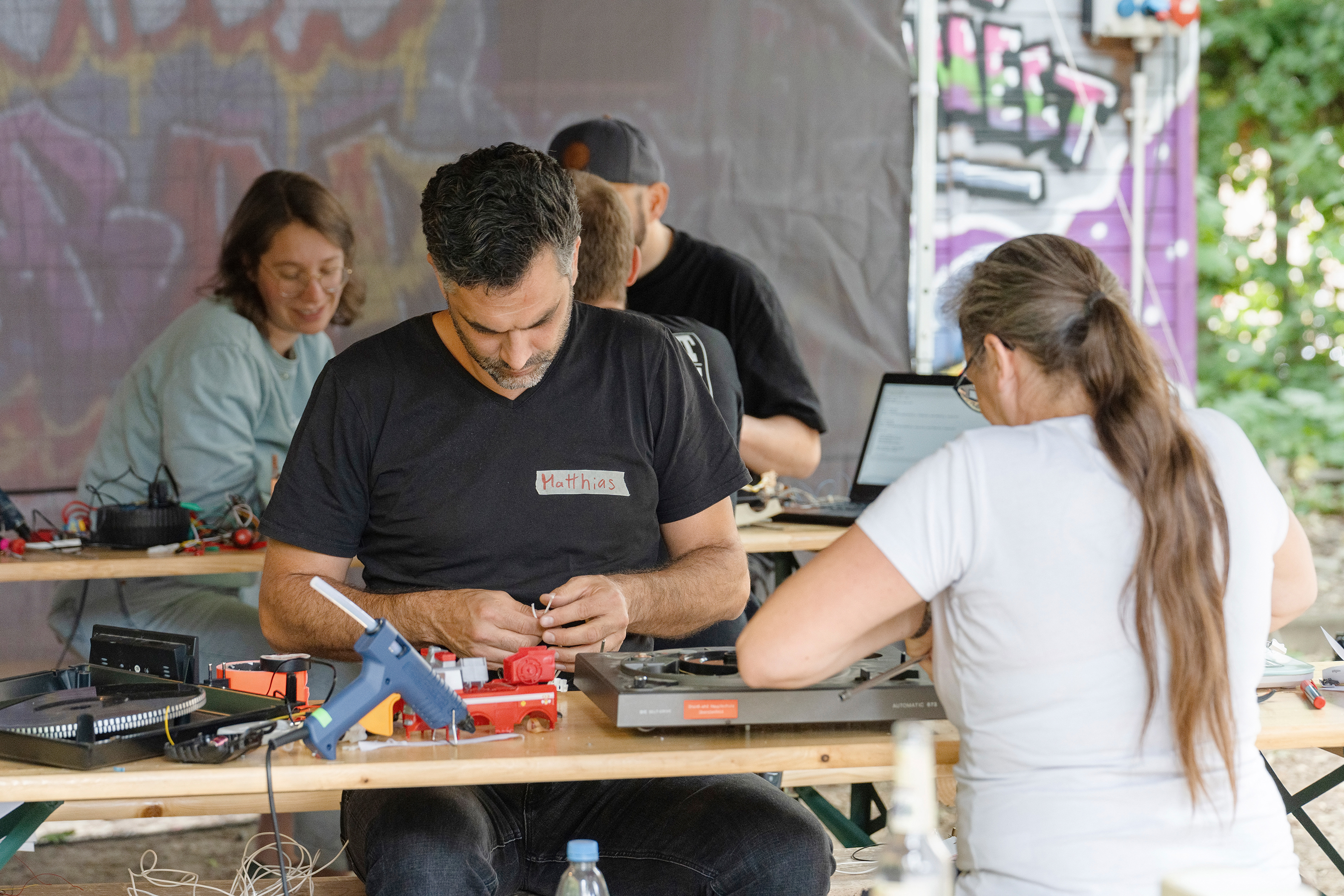Das fünftägige Camp „Empowering Sustainability – Mentor*innen für den Klimaschutz“ steht unter dem Thema Kreislaufwirtschaft und wie sie spielerisch vermittelt werden kann. Hier können sich Menschen zu Mentor*innen, also Vermittler*innen ausbilden lassen, um die Themen Nachhaltigkeit und Klimaschutz im Zusammenspiel von Making, Technologie, Handwerk und Kunst weiterzugeben.