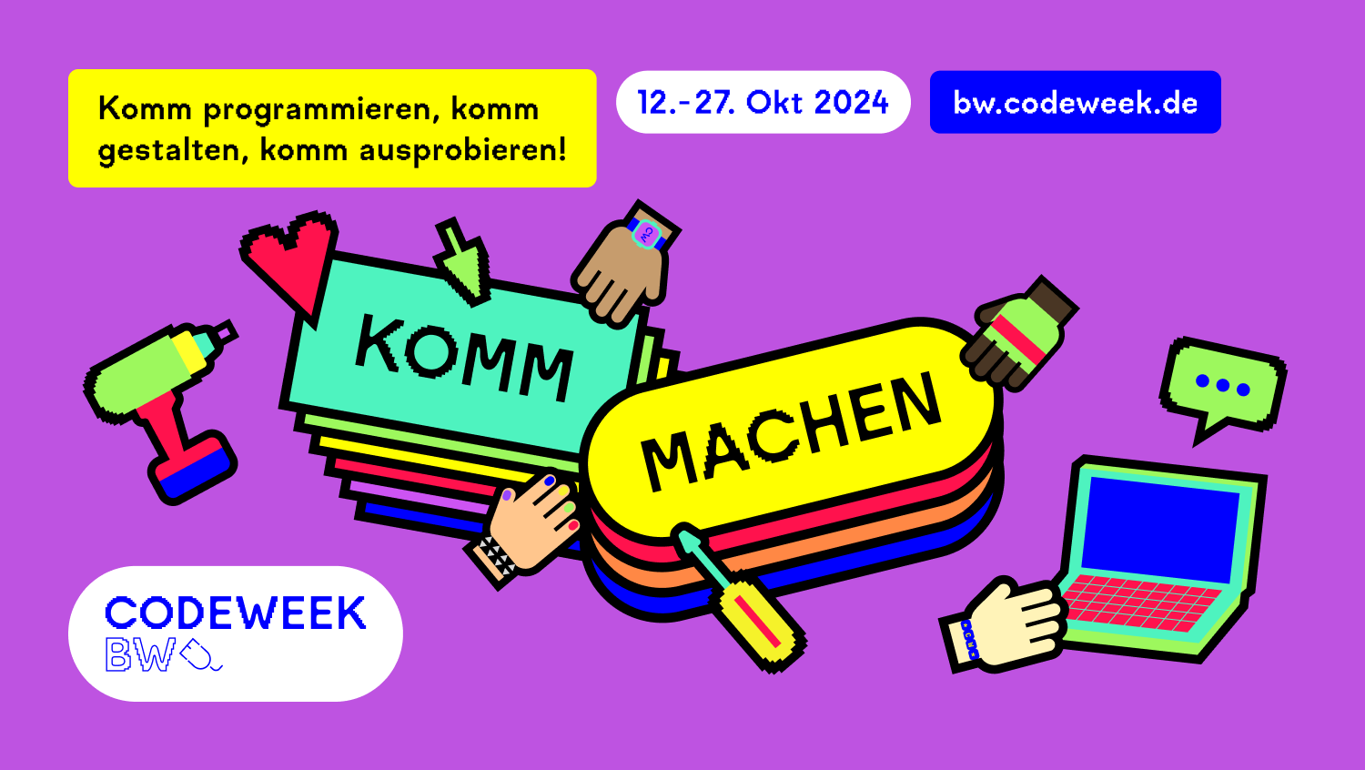 Die Code Week wurde 2013 als europäische Graswurzel-Initiative und offene Veranstaltungsreihe ins Leben gerufen und vermittelt Interessierten aller Altersstufen die Freude an Technik, Kreativität und Teamwork. Die Code Week Baden-Württemberg ist Teil der bundesweiten Initiative Code Week Regio-Hubs, bei der sich engagierte Menschen und Organisationen zusammenschließen, die bei sich vor Ort Lust aufs Coden und Tüfteln machen wollen. Sie sind eine bundesweite Initiative von Körber-Stiftung und Code Week Germany.